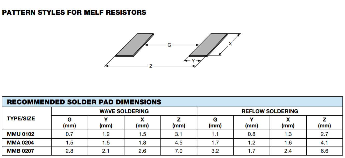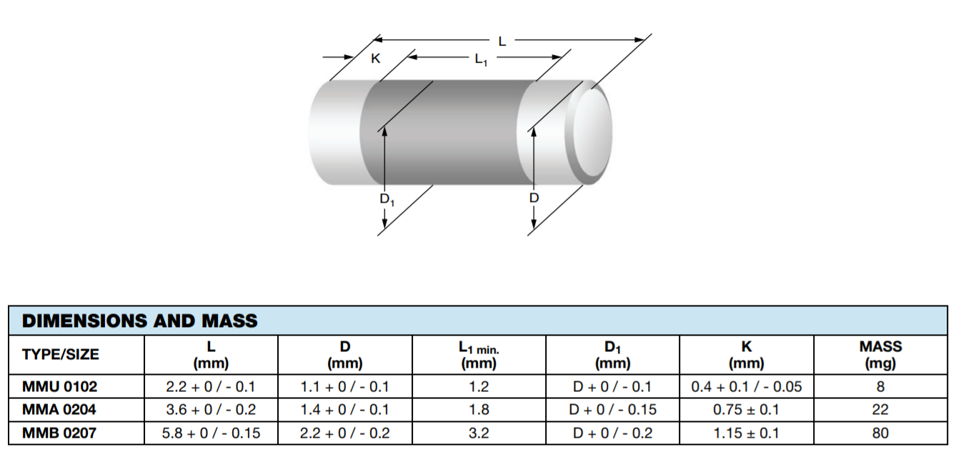 این عکس سایز پکیج MELF را برای سه دیود مختلف نشان می دهد. طبق این دیتاشیت میتوانید برای خود فوت پرینت تستی بسازید. اگر برای قطعات خود فوت پرینت میسازید یا پکیج قطعه را پیدا کنید و طبق دیتاشیت، پکیج موردنظر فوت پرینت بسازید یا خودتان حتماً اندازهگیری کنید.